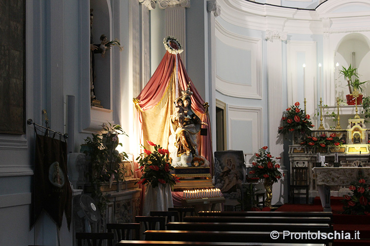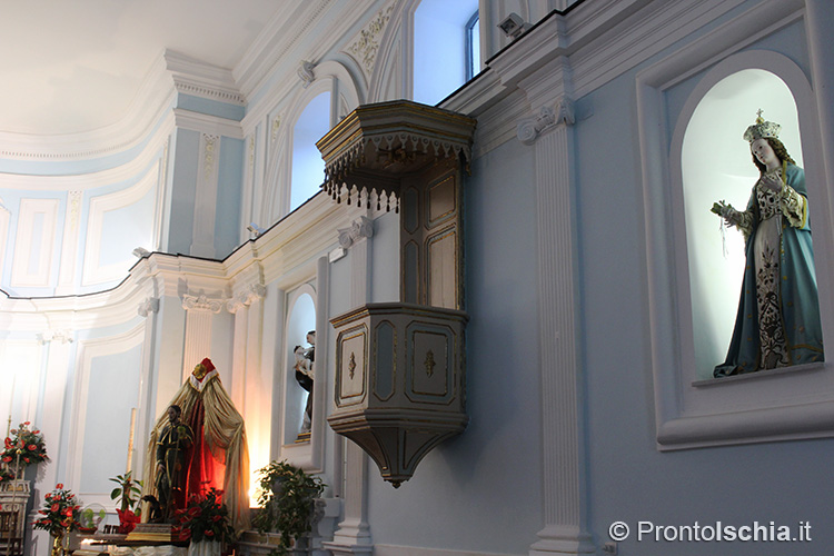 Se i centri abitati sono molti più dei sei comuni in cui è divisa amministrativamente l'isola, il numero di chiese è, a sua volta, molto maggiore delle frazioni, dei borghi e dei villaggi sparsi per il territorio. Per rendersene plasticamente conto basta raggiungere Piazza San Rocco a Barano d'Ischia. All'inizio e alla fine della piazza ci sono, infatti, due chiese, una di fronte l'altra: a valle, la parrocchia di San Sebastiano, e su in cima la chiesa di San Rocco, patrono di questo comune collinare secondo, per estensione, soltanto a Forio.