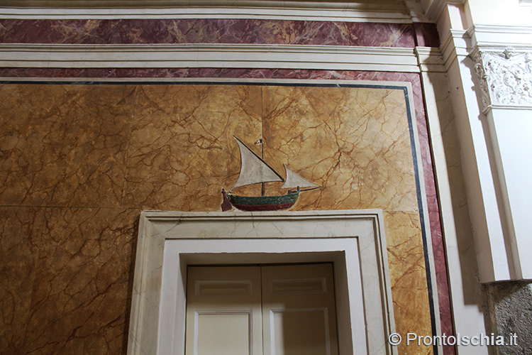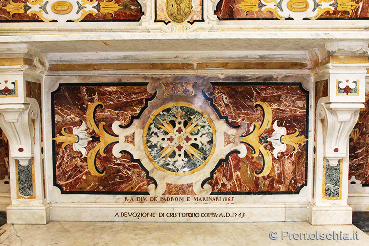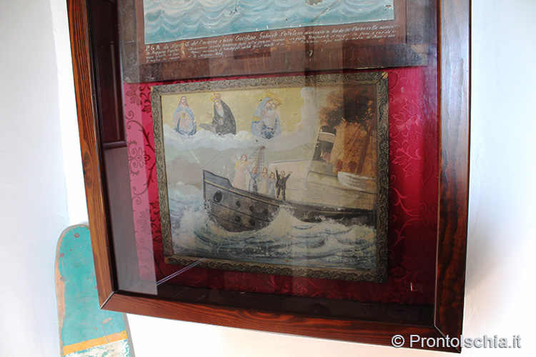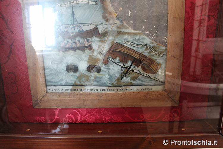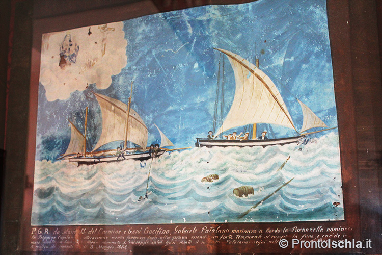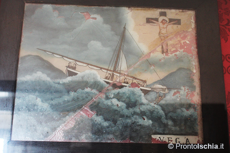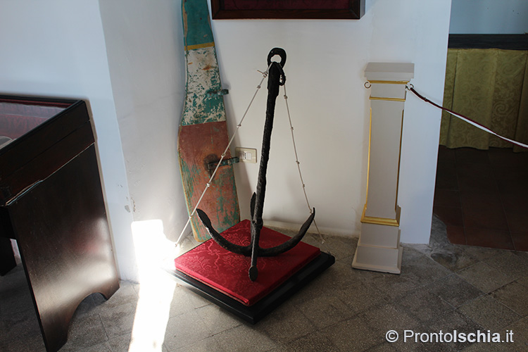 La sagrestia sorprende con velieri imponenti, quadri che narrano scene di naufragio, ancore antiche e iscrizioni devozionali, elementi che raccontano storie di un tempo in cui ogni traversata sul mare era un atto di coraggio e fede. Ogni battuta di pesca o imbarco per raggiungere Napoli richiedeva l’invocazione dei santi per proteggere se stessi e le proprie famiglie, da qui le incisioni "V.F.G.A." (Voto Fatto Grazia Avuta) e "P.G.R." (Per Grazia Ricevuta).