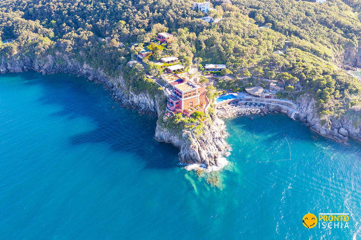 La villa, completamente bianca, è affiancata da due dépendances e nascosta da un parco di lecci, eucalipti e pini che fiancheggiano il viale d’accesso. L’atmosfera è quella di un luogo appartato, quasi inaccessibile, dove la natura sembra aver preso il sopravvento. Fu il giornalista e politico locale Luigi Patalano a volerla costruire, scegliendo una posizione a picco sul mare, immersa nella macchia mediterranea. L’ispirazione veniva da un castello medievale visto in Francia, di cui la villa riprendeva le linee forti e un po’ austere. C’è chi sostiene che la scelta di Zaro, così come alcuni elementi architettonici, risentissero dell’influenza della massoneria a cui Patalano era legato – una presenza tutt’altro che insolita tra gli intellettuali dell’epoca. Ipotesi esoteriche a parte, e mai realmente confermate, poco prima della Seconda Guerra Mondiale Patalano dovette vendere la proprietà a tale barone Fassini, che però non se ne curò, lasciandola lentamente scivolare in uno stato di abbandono.