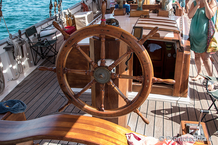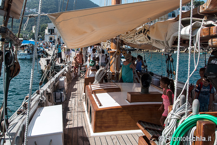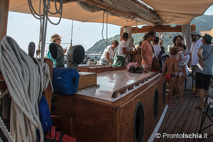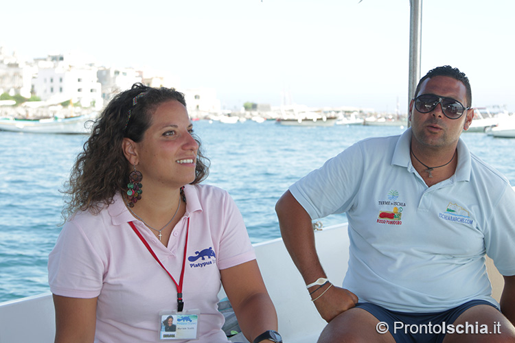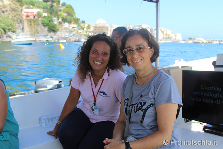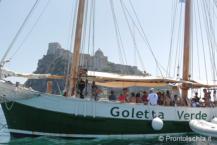 Abbiamo trascorso una piacevole mattinata in compagnia di Myriam Scotti e Pasquale Mirabella, le due guide che ci hanno accompagnato in giro per la baia di Cartaromana a bordo di un’imbarcazione dal fondo trasparente. Occasione della visita, la presenza sull’isola di “Goletta Verde” storico veliero di Legambiente, per due giorni attraccato a Ischia Ponte nelle acque antistanti il Castello Aragonese.
