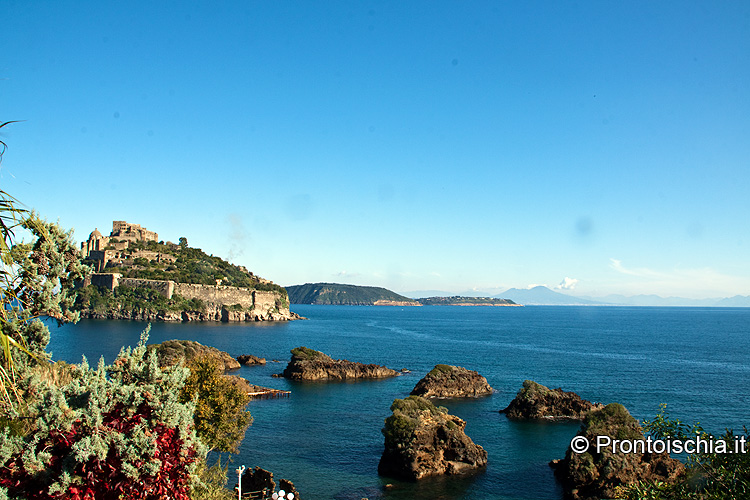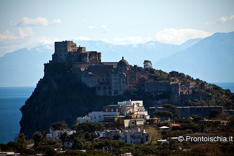 Dopo di che, in pomeriggio, visita il vicino Castello Aragonese. Se ti senti stanco/a o fa caldo c’è un comodo ascensore che ti risparmia le fatiche della salita e ti porta fin quasi sulla vetta dell’antica fortezza, ben oltre i cento metri sul livello del mare. Già solo il panorama, che abbraccia la penisola sorrentina dominata dai Monti Lattari, fino al golfo di Gaeta, vale il prezzo del biglietto.