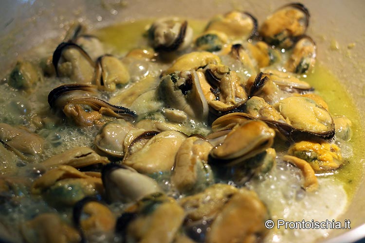 In una padella cuocere le cozze insieme a un filo d'olio, aglio e un pò di vino.