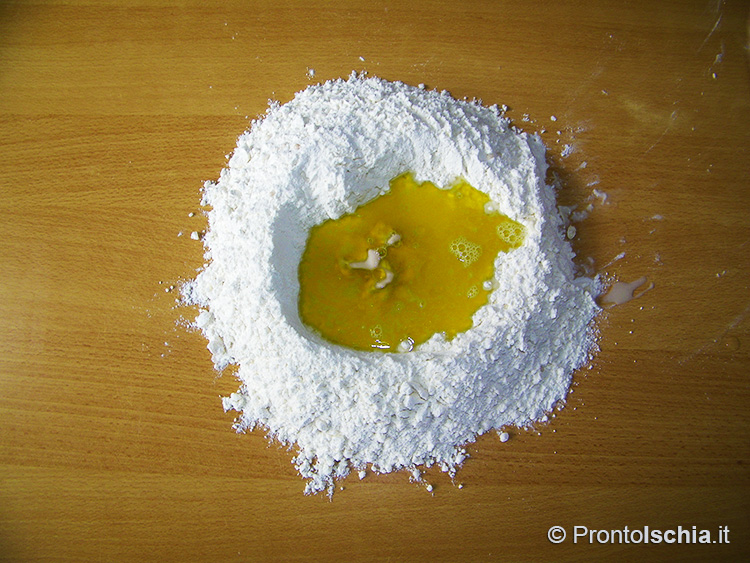 Su un piano di lavoro disporre la farina a fontana (1) e versare al centro l'olio e l’acqua tiepida con il lievito sciolto (2). Aggiungere un pizzico di sale (3) e lavorare l’impasto fino a che non ottenete una palla omogenea (4). Mettere l’impasto in una terrina (5) e coprirlo con un panno da cucina (6). Lasciate che cresca un paio d’ore (7) prima di servirvene.