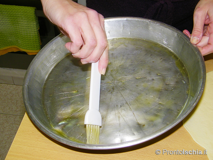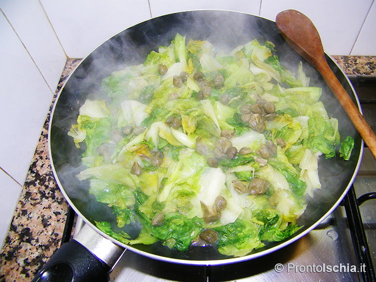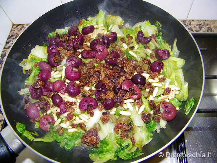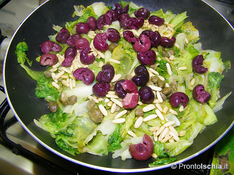 Prima di andare avanti è bene puntualizzare che la sequenza proposta è solo una delle varianti possibili. Infatti c’è chi lessa prima la verdura in acqua e sale; chi spegne la scarola in padella quando è ancora un pò croccante perchè continuerà a cuocere in forno; chi per primi tosta i pinoli; chi aggiunge altro sale nonostante i capperi, le olive e le acciughe. Chi addirittura soffrigge assieme tutti gli ingredienti saltando in ultimo la scarola. Tutte scelte legittime purchè si faccia attenzione all’equilibrio dei sapori e, soprattutto, a non bruciare il tutto.