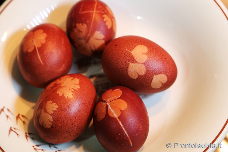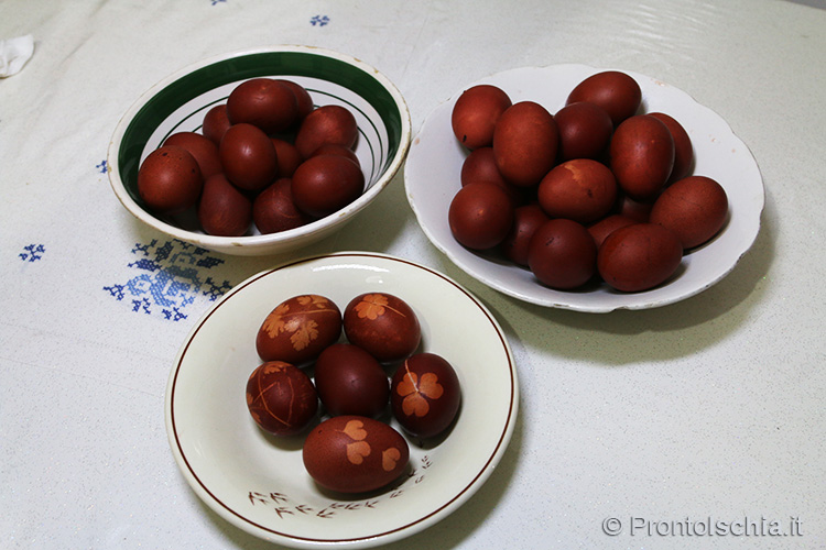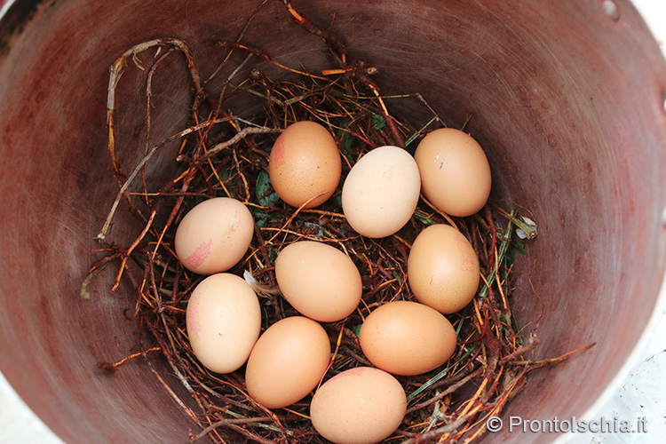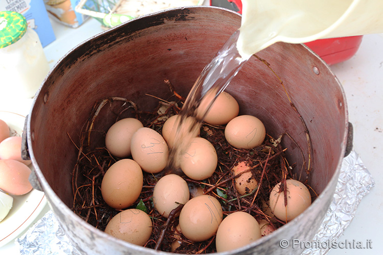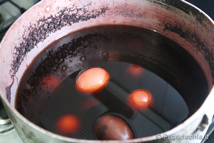 Passiamo ora al procedimento per colorare le uova. Innanzitutto, bisogna pestare col martello le radici della pianta in modo da facilitare la fuoriuscita del colore. Il passo successivo è posizionare un primo strato di radici sul fondo di una pentola, adagiarvi sopra le uova, posizionare il secondo strato di radici, così procedendo a seconda del numero di uova che si desidera colorare. Coprire il contenuto con acqua fredda, salare, e portare il tutto a ebollizione a fiamma bassa.