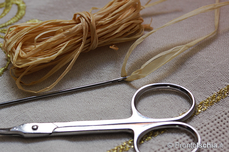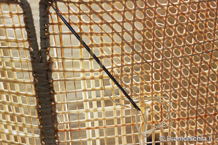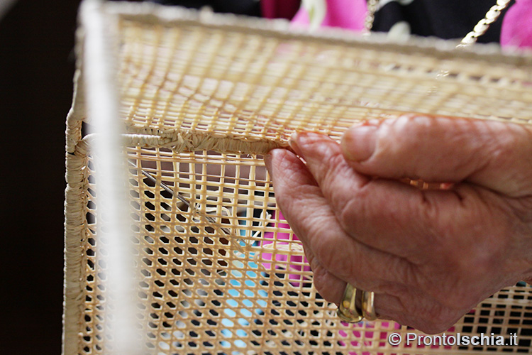 Realizzata la struttura bisogna affidarsi a mani sapienti in grado di ricamare l’oggetto esclusivamente con ago e rafia. Qui entra in gioco l’antica tradizione della lavorazione della paglia, la stessa di cui narrano le sorelle Fitzgerald nel loro report di viaggio sull’isola d’Ischia agli inizi del ‘900, quando appunto sulle pendici del Monte Epomeo veniva coltivato il grano "Carosella" che poi le donne di Serrara Fontana rivendevano alle ricamatrici di Lacco Ameno, come Maria Giovanna Catuogno e Restituta Patalano, rispettivamente bisnonna e nonna di Antonio Monti. La tradizione continua oggi per mano di ricamatrici di fiducia che hanno un rapporto privilegiato con Antonio e i figli. Sono loro a dare il "langhè" sui bordi del telaio e ad allacciare successivamente i fili orizzontali, verticali e trasversali del ricamo vero e proprio.