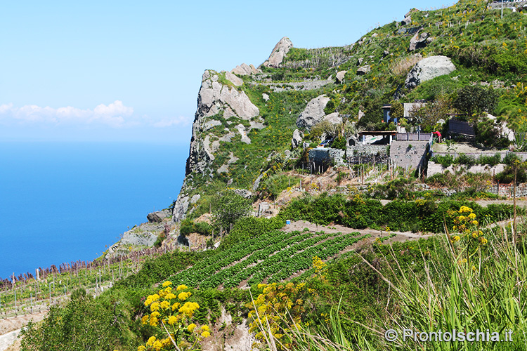 Mentre si percorre il sentiero che porta al "Salto degli Angeli", l'altro nome con cui è conosciuto il belvedere dei Frassitelli, scorgiamo tutt'attorno il paesaggio del vino di Ischia, felice sintesi del connubio tra la geologia, l'ambiente e il lavoro degli agricoltori, che qui hanno intensamente sfruttato la grande quantità di tufo verde, soprattutto per realizzare le "parracine", i caratteristici muri a secco a protezione delle terrazze dove veniva - e in molti casi viene ancora -, coltivato il vino.